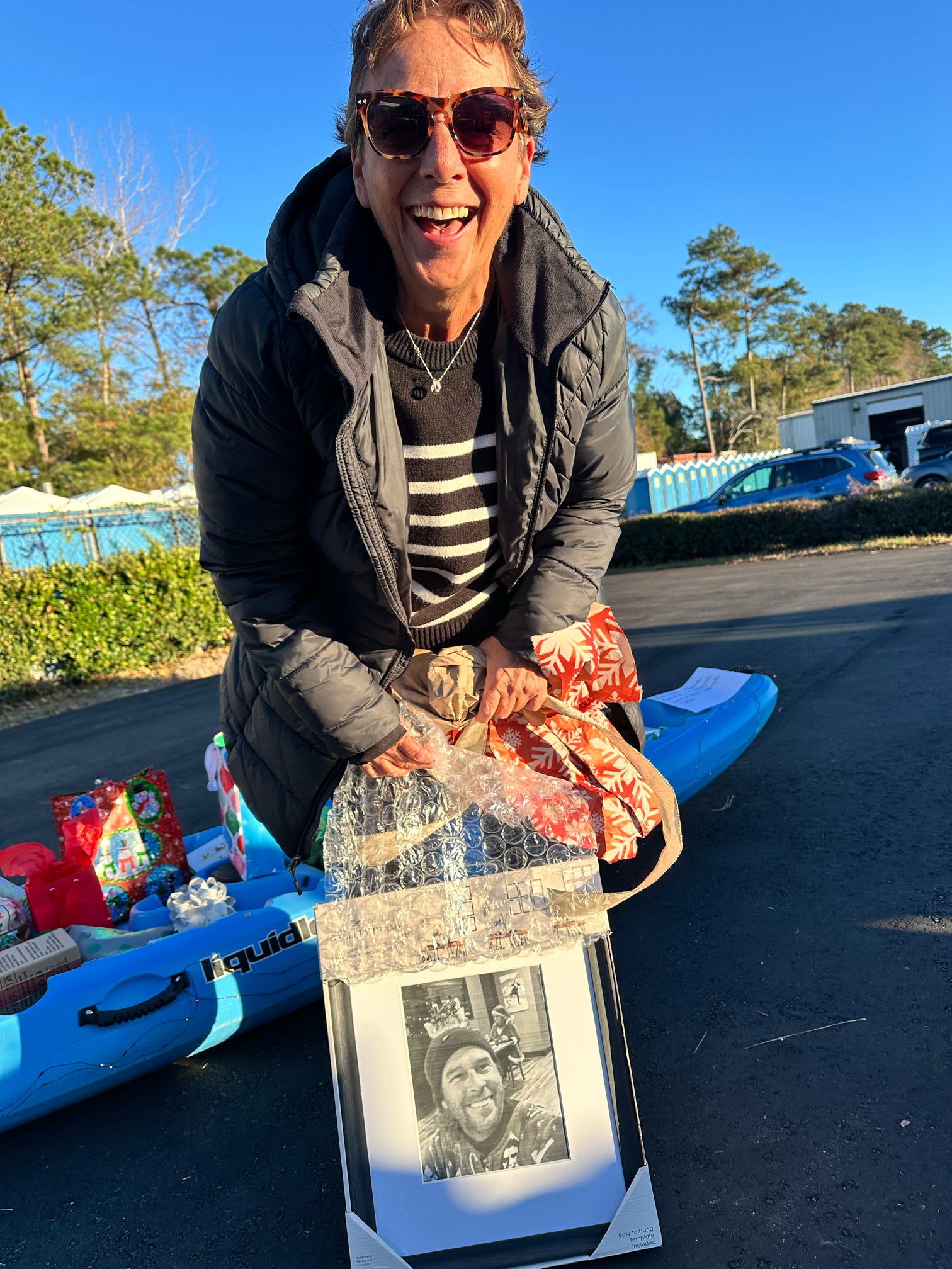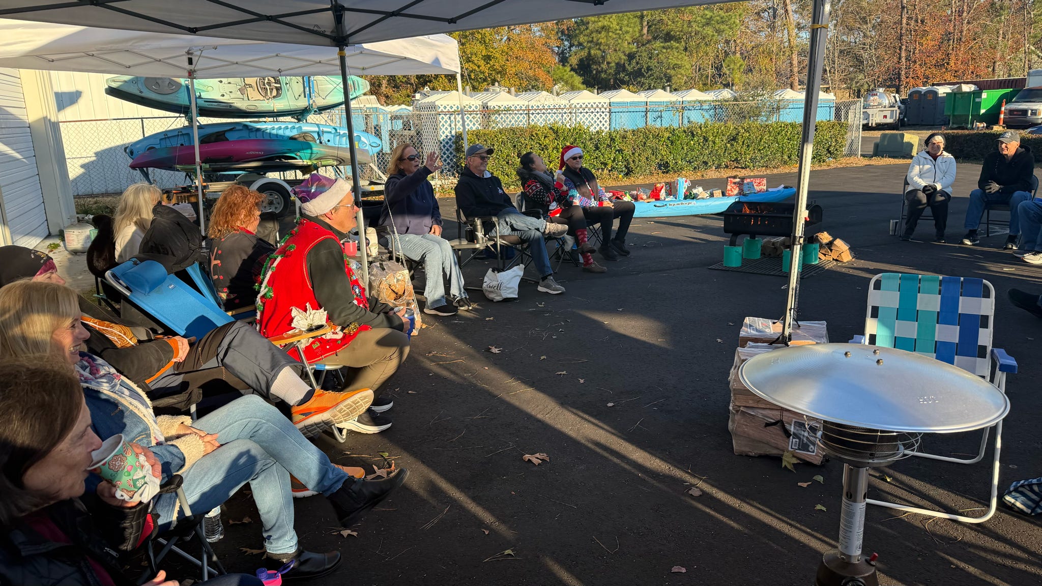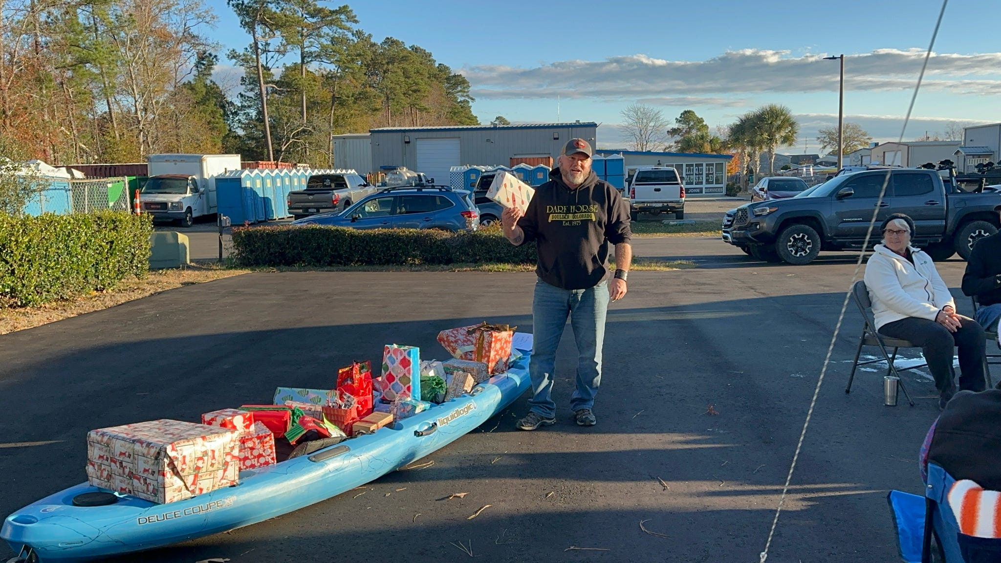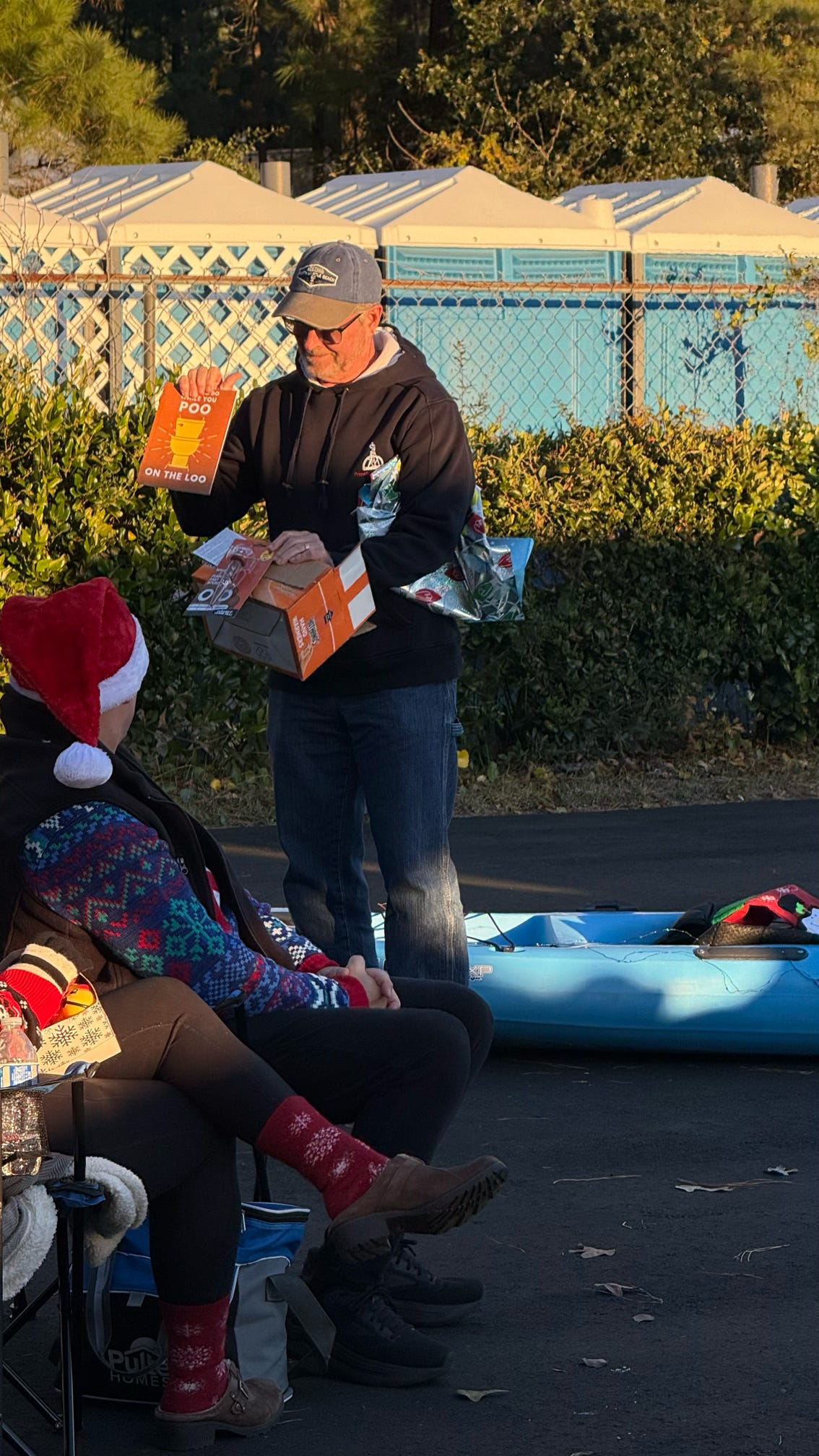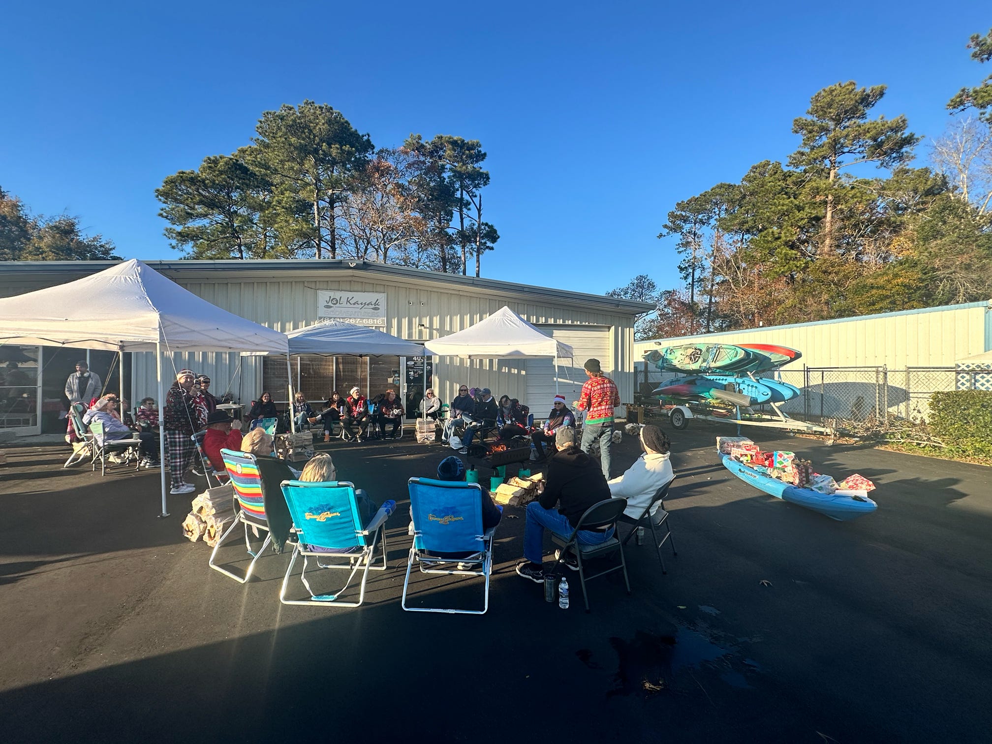 The evening kicked off with hugs, laughter, and warm spirits. Then came the tradition: one by one, presents were dropped onto our kayak present sleigh—Santa would be jealous.