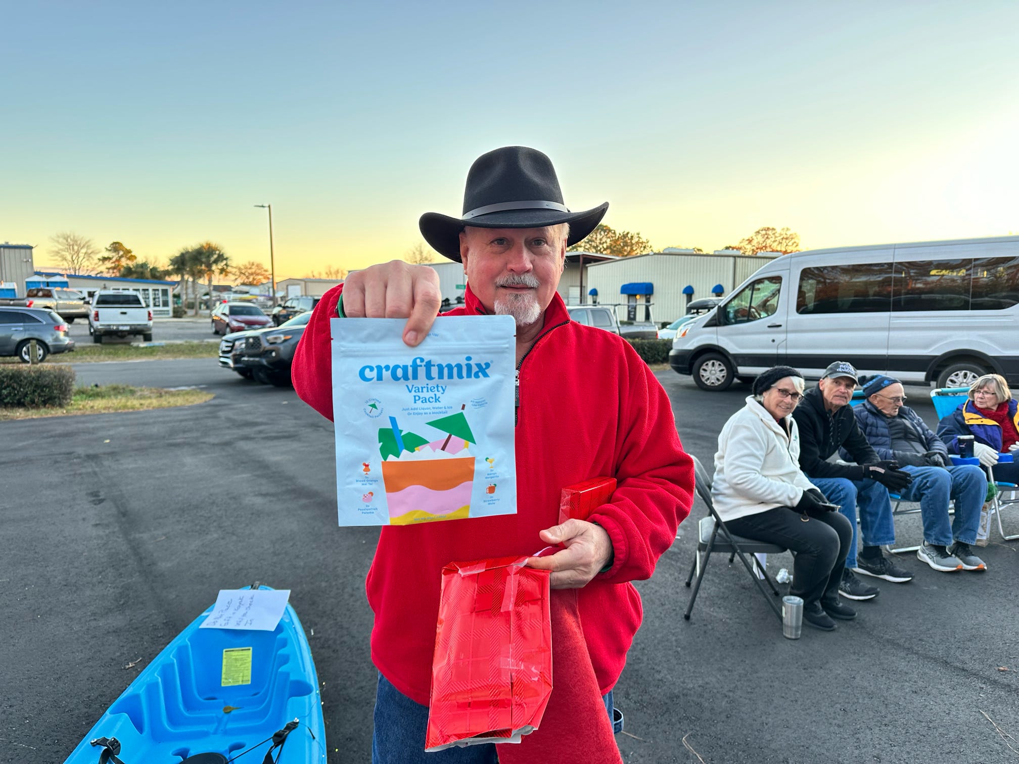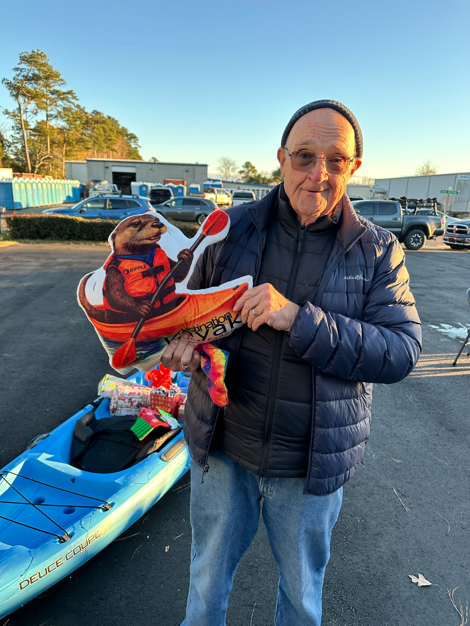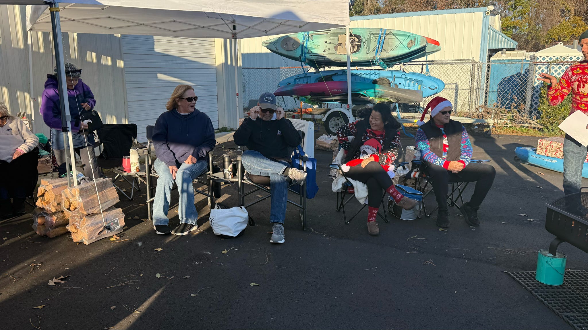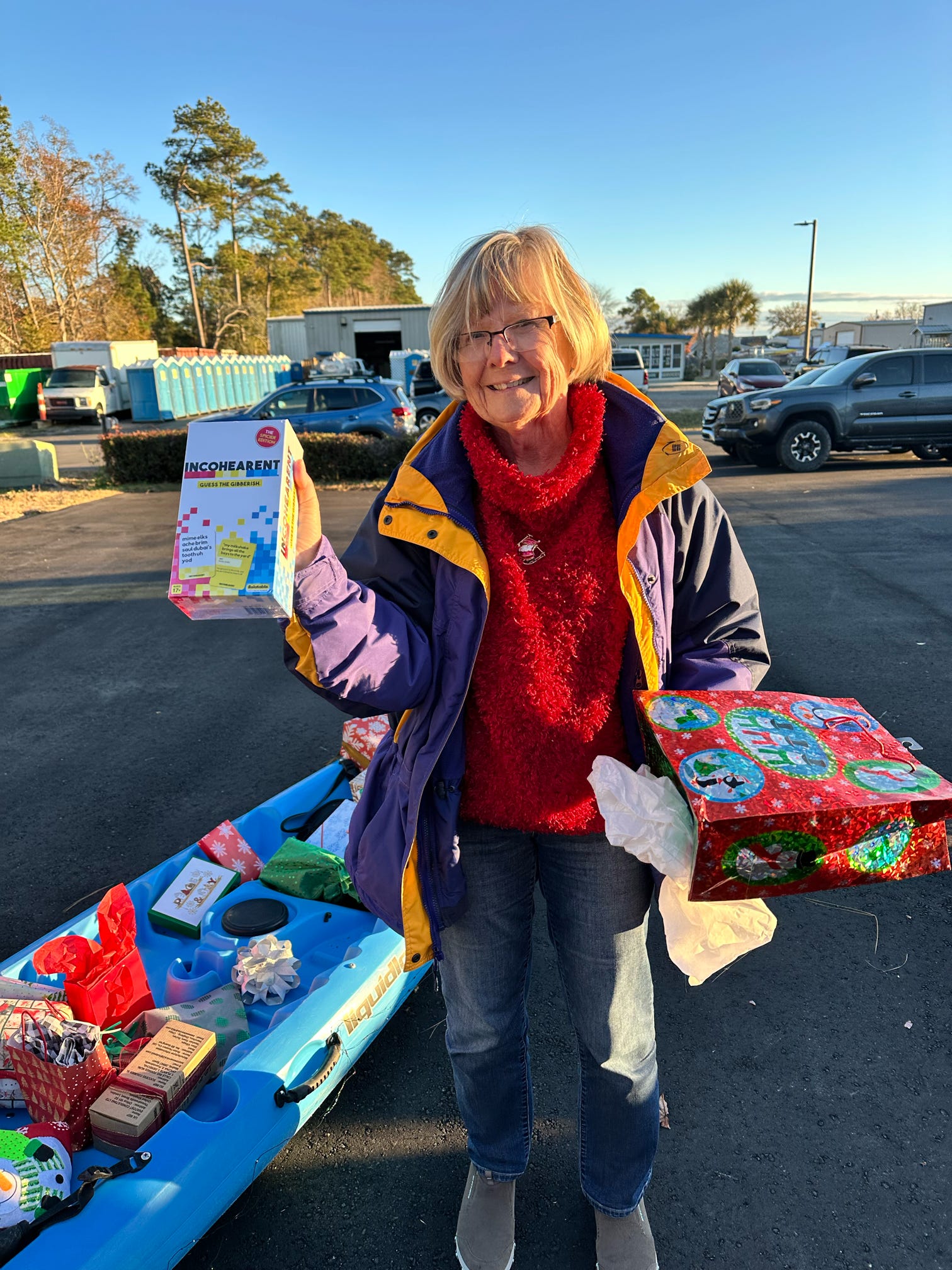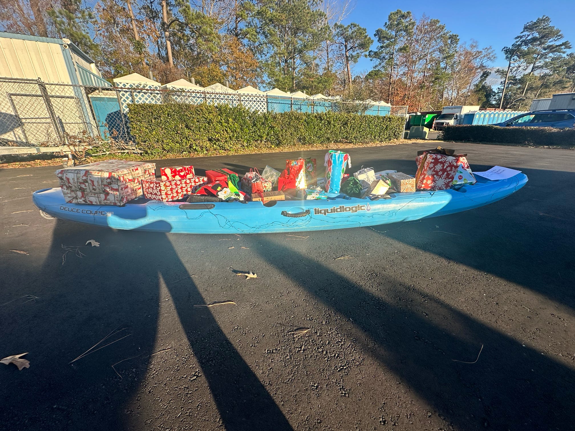 The evening kicked off with hugs, laughter, and warm spirits. Then came the tradition: one by one, presents were dropped onto our kayak present sleigh—Santa would be jealous.