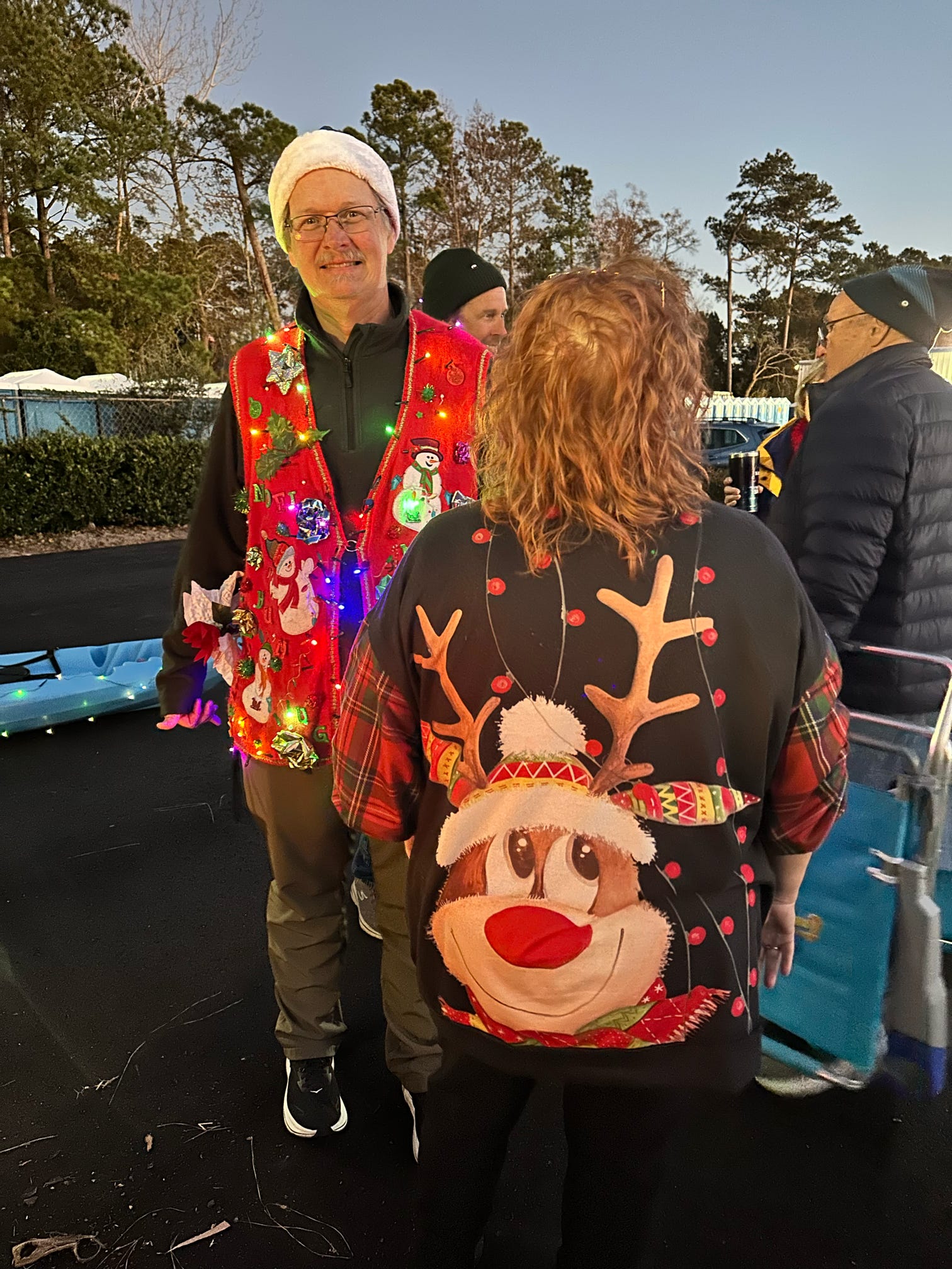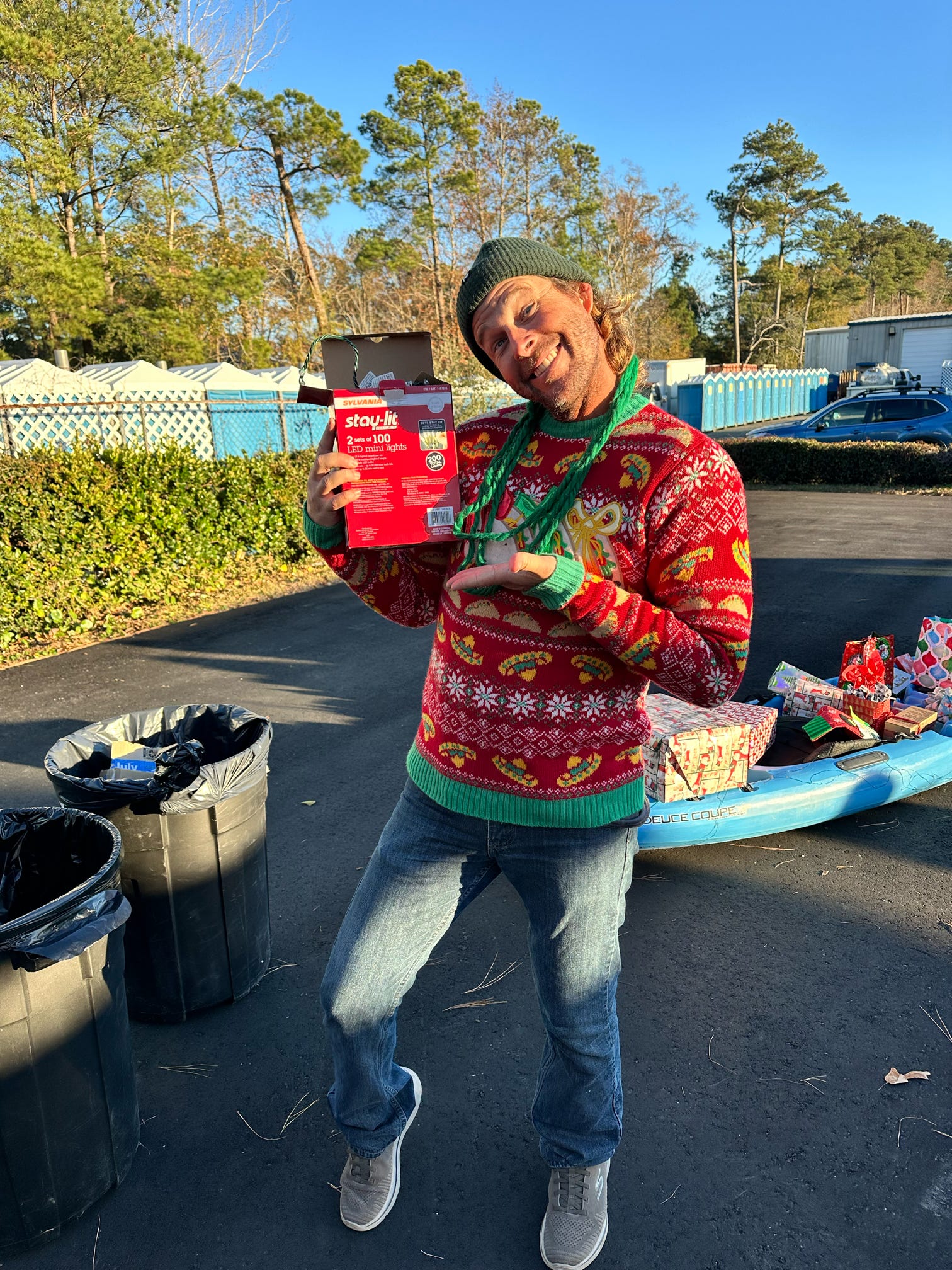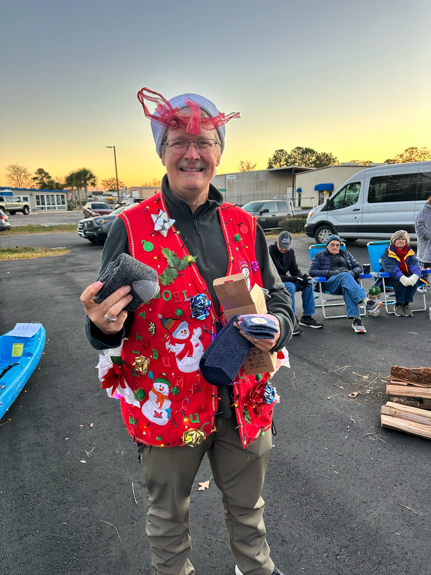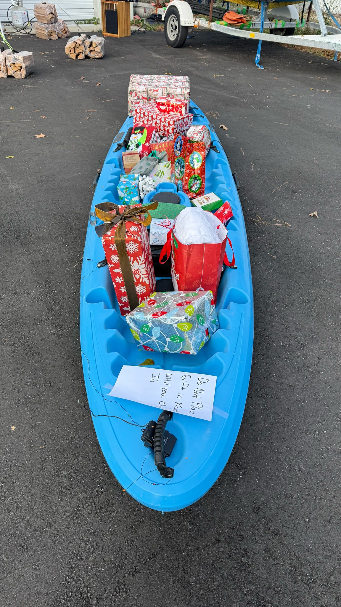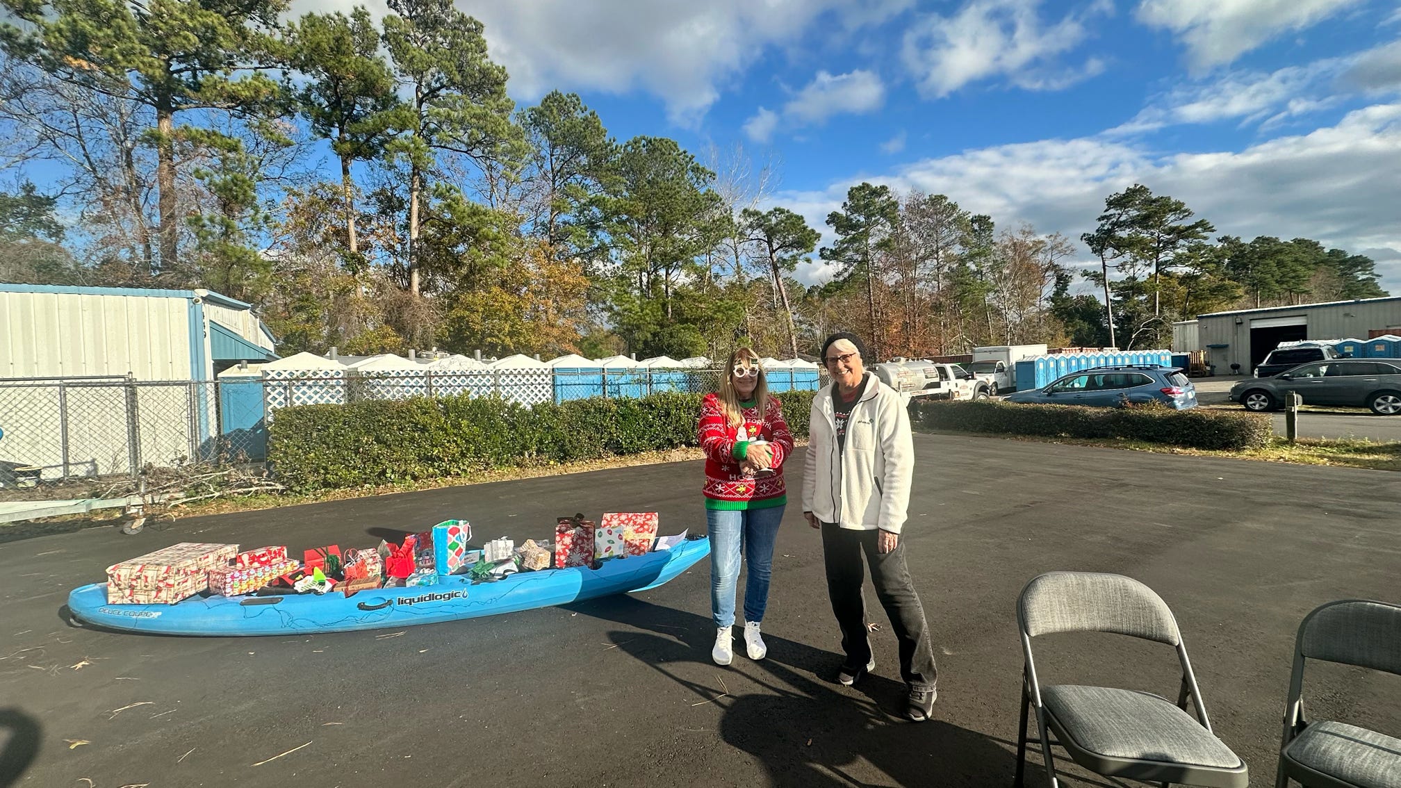 The evening kicked off with hugs, laughter, and warm spirits. Then came the tradition: one by one, presents were dropped onto our kayak present sleigh—Santa would be jealous.