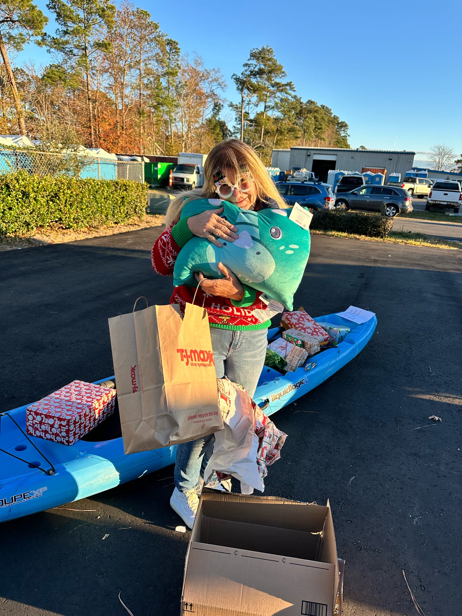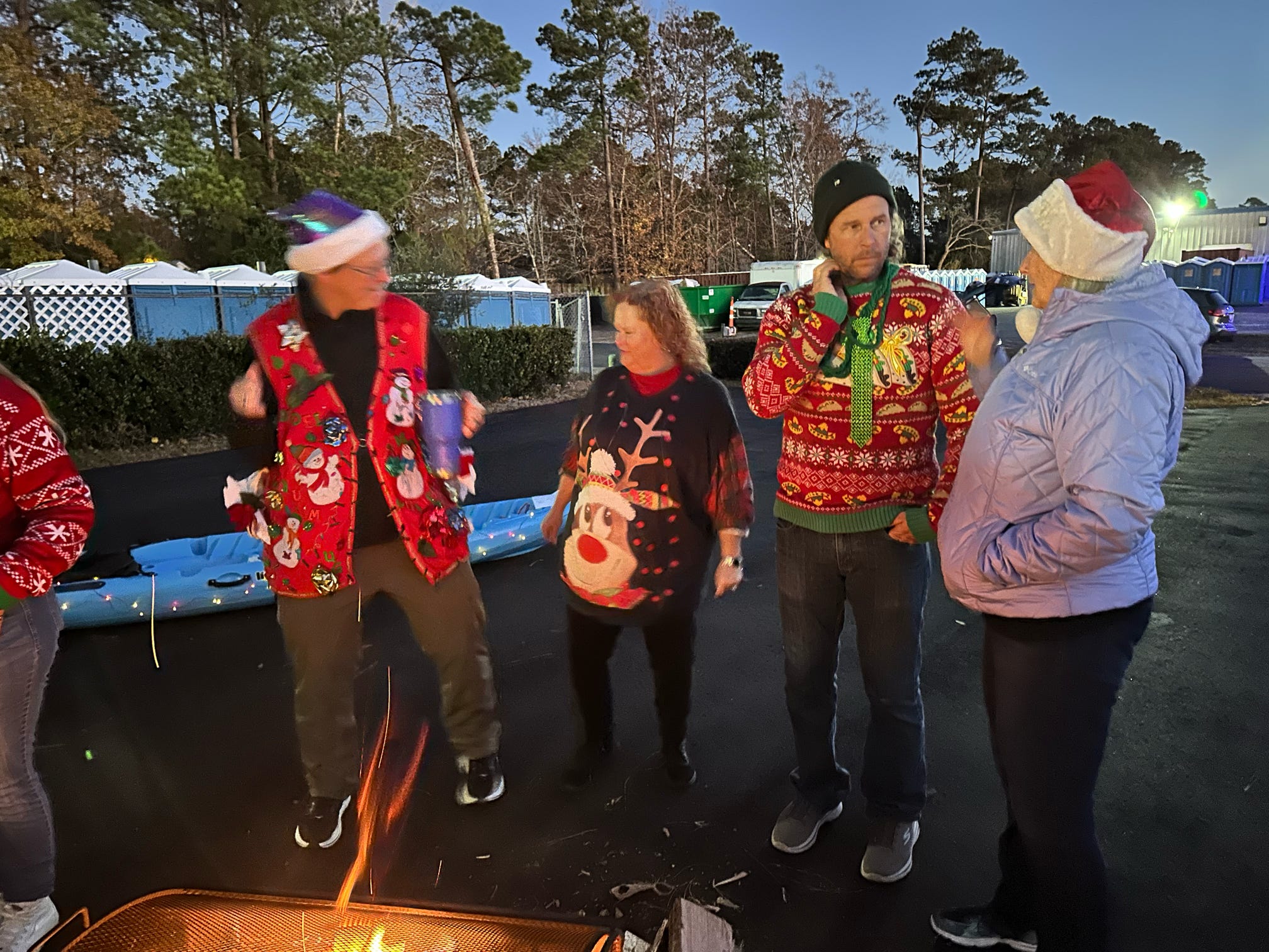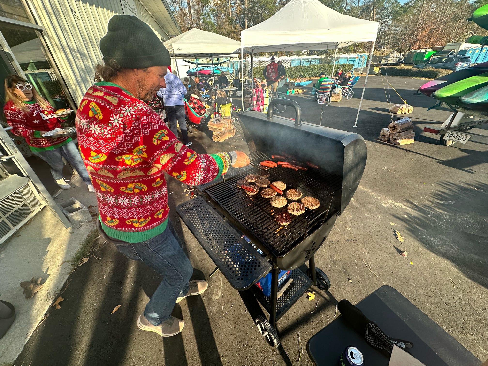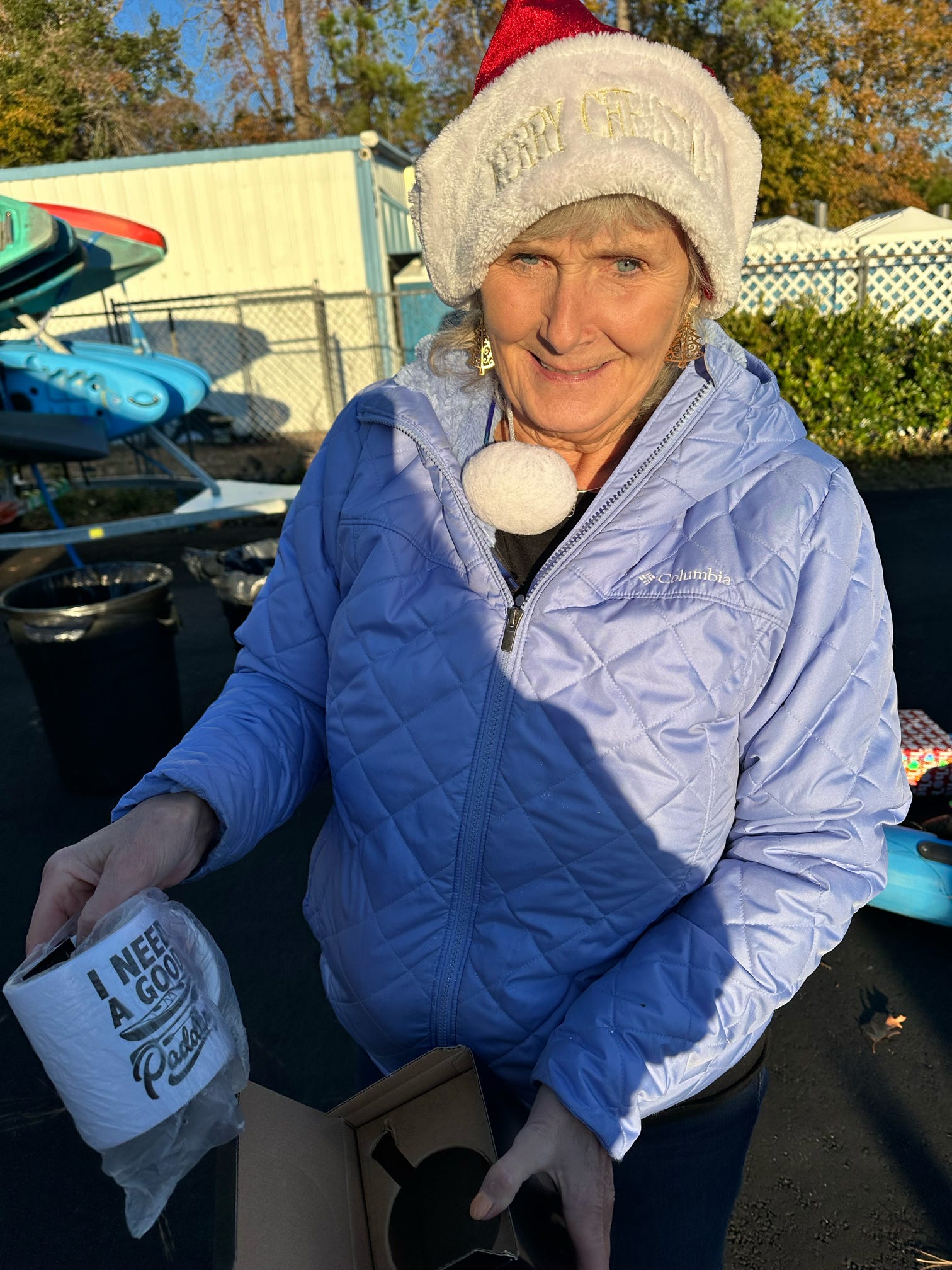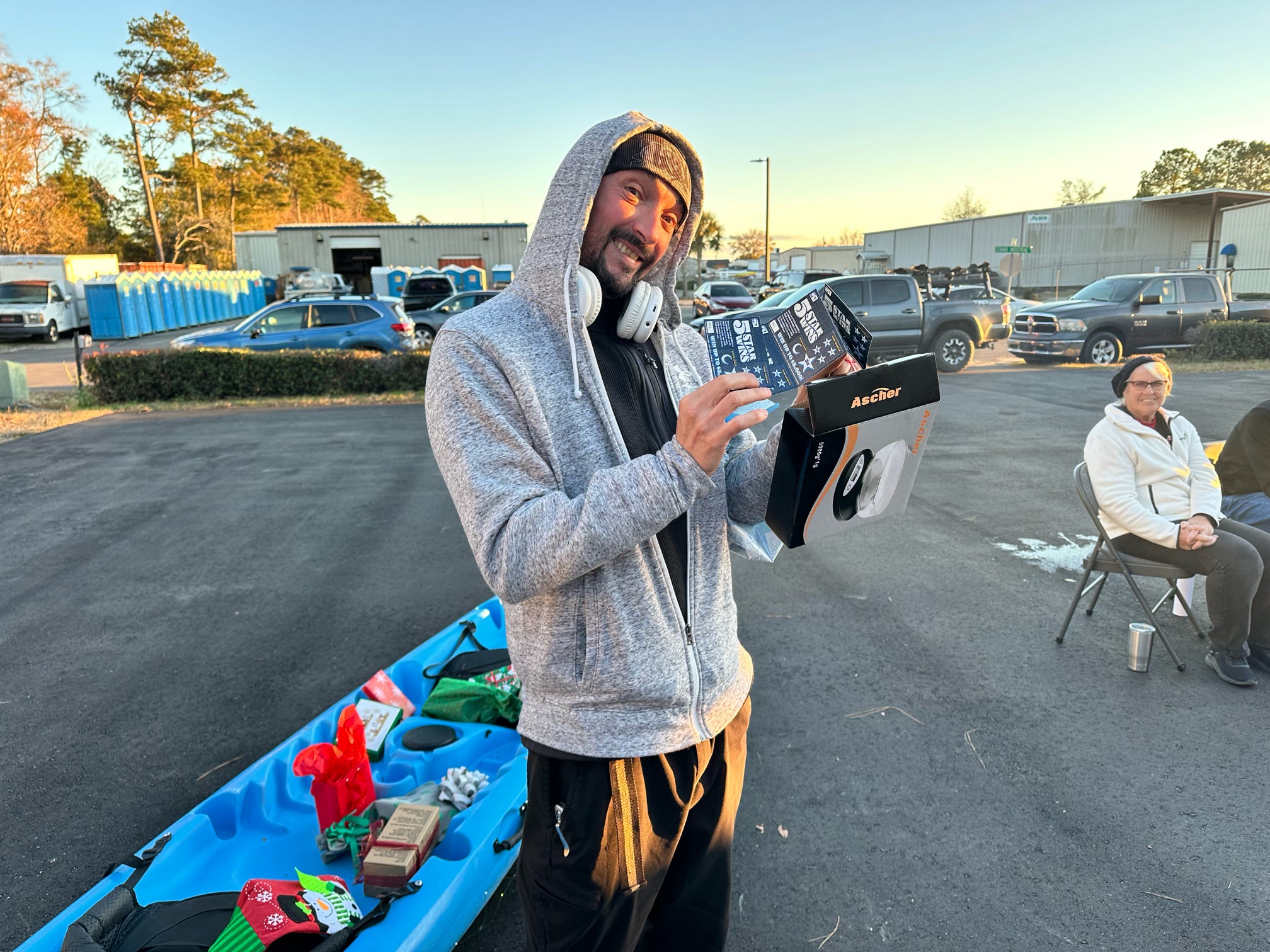 The evening kicked off with hugs, laughter, and warm spirits. Then came the tradition: one by one, presents were dropped onto our kayak present sleigh—Santa would be jealous.