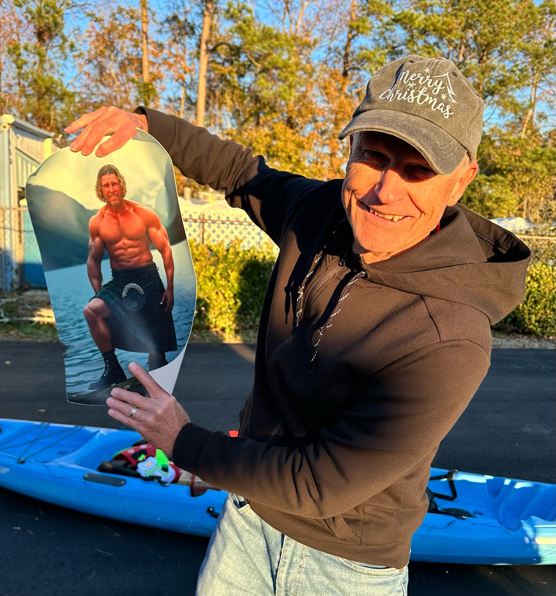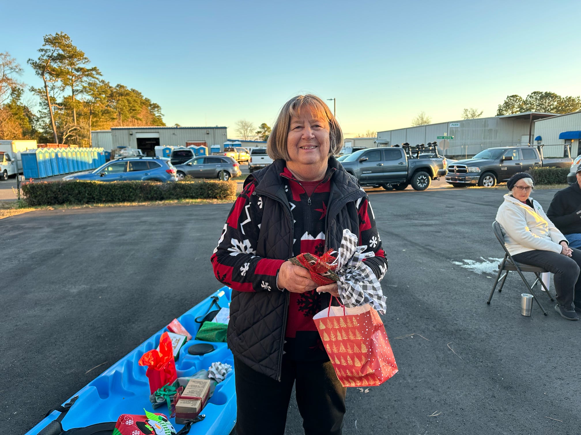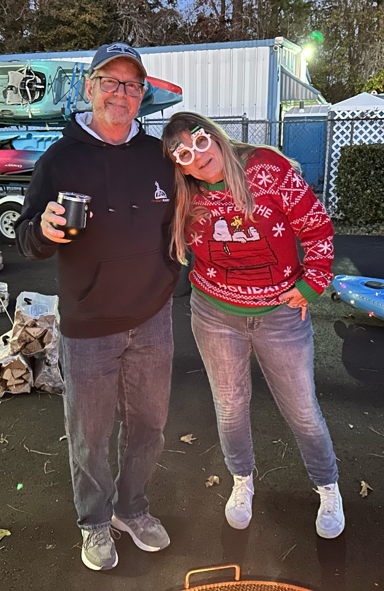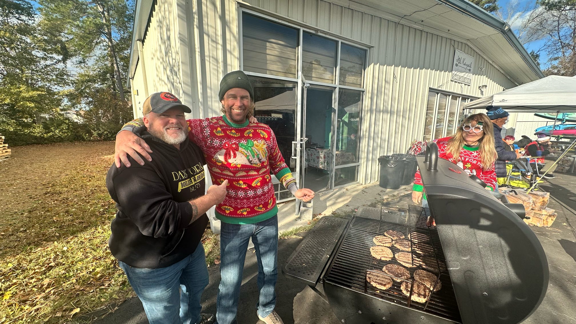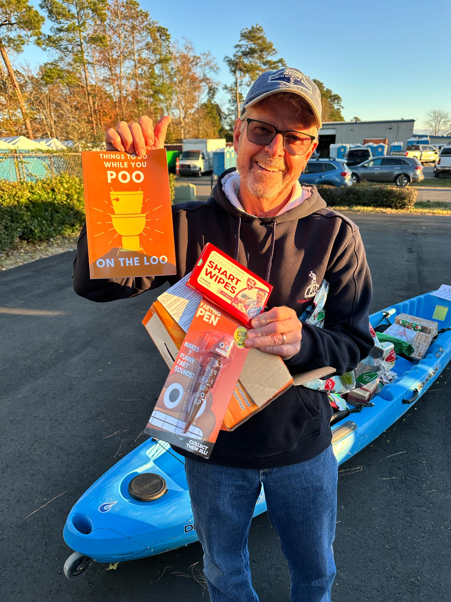 The evening kicked off with hugs, laughter, and warm spirits. Then came the tradition: one by one, presents were dropped onto our kayak present sleigh—Santa would be jealous.