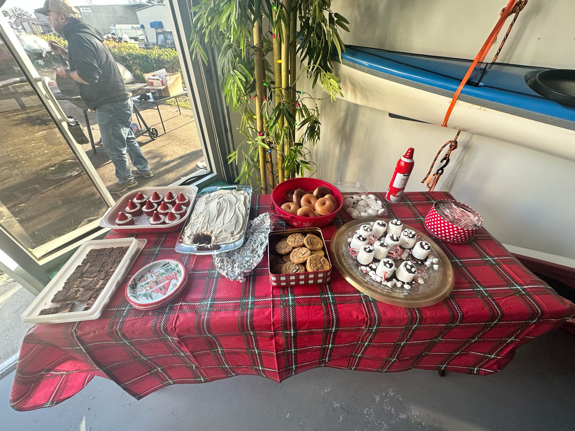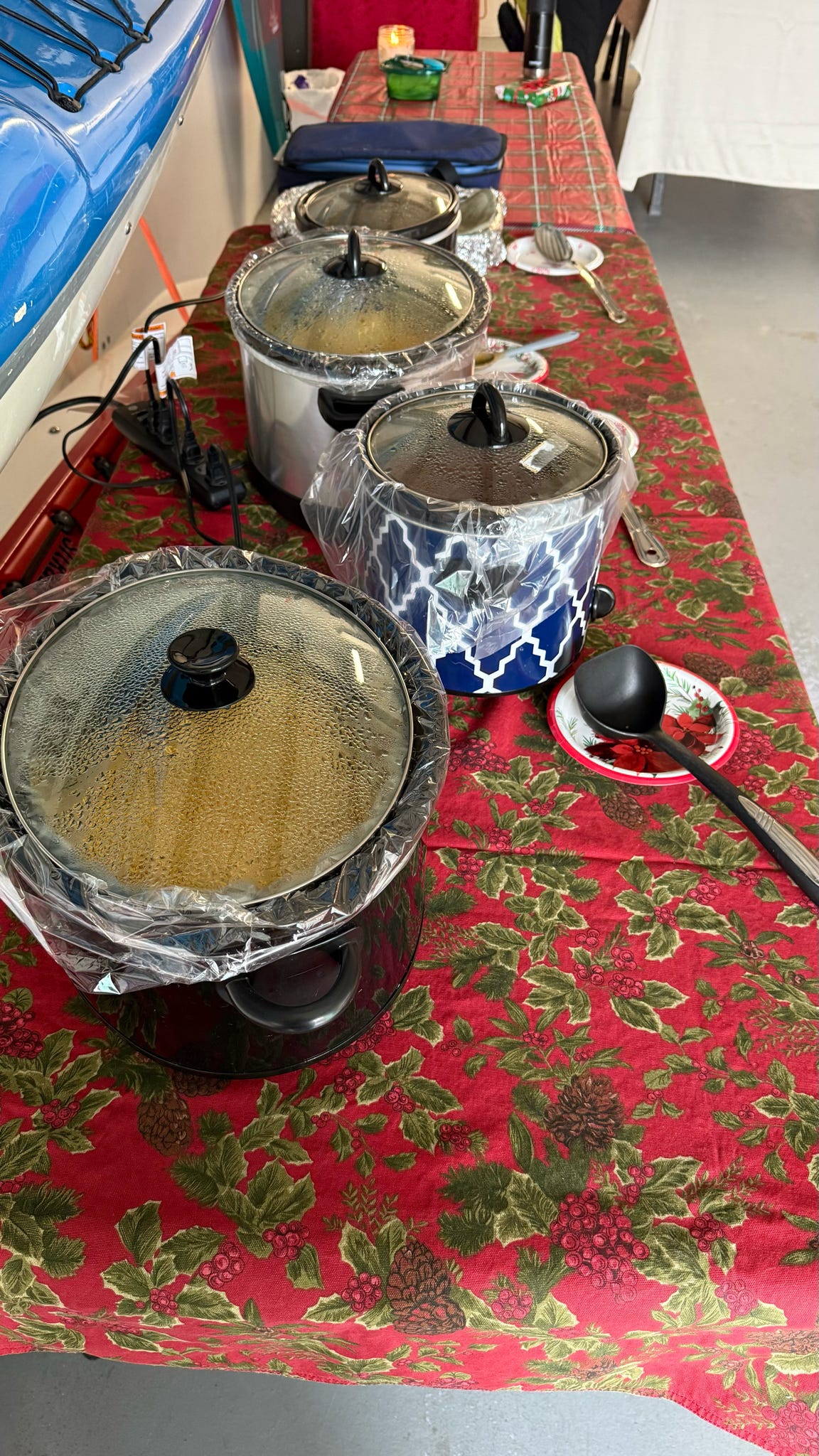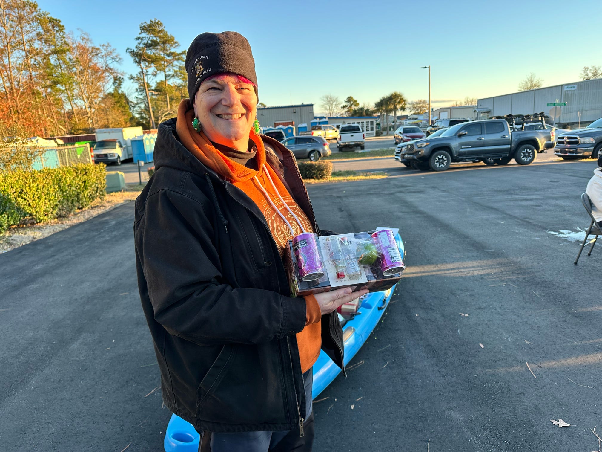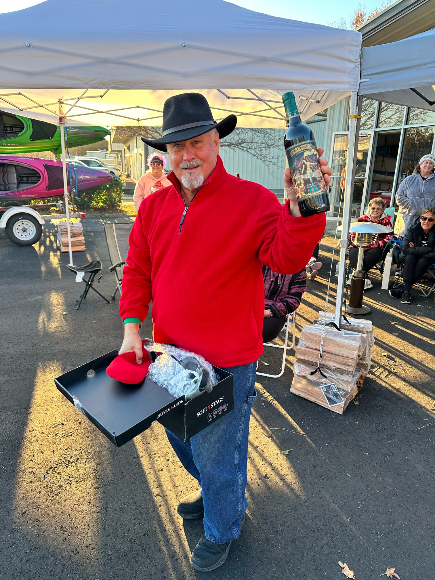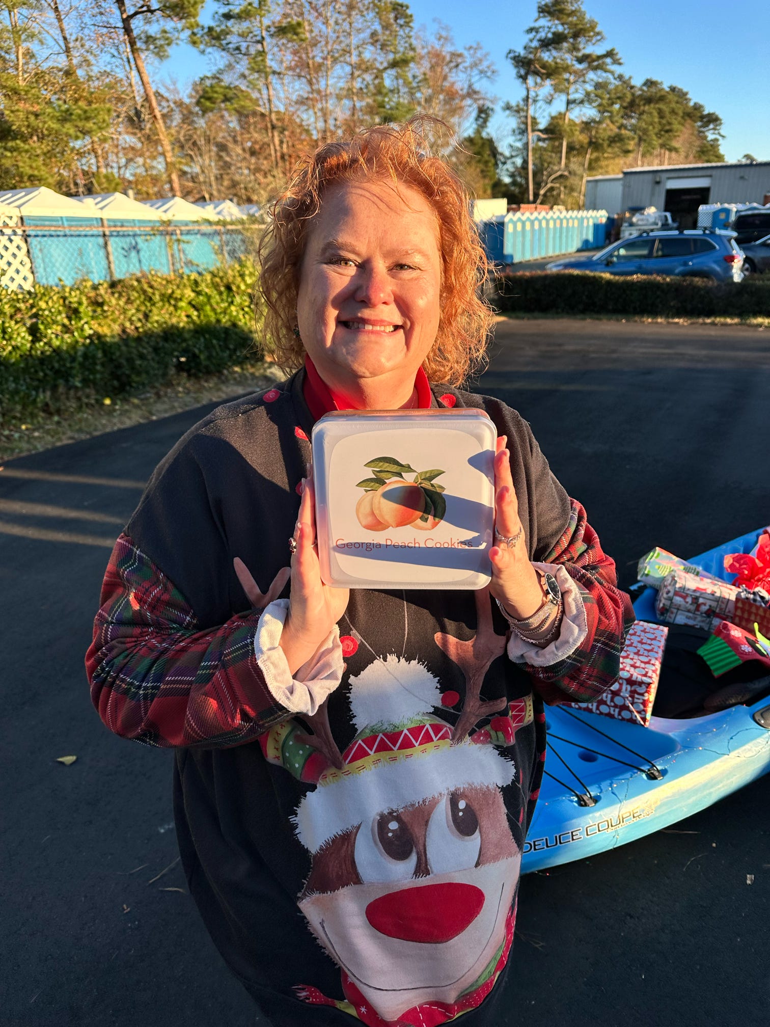 The evening kicked off with hugs, laughter, and warm spirits. Then came the tradition: one by one, presents were dropped onto our kayak present sleigh—Santa would be jealous.